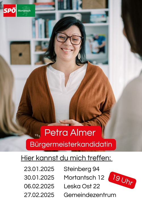 Triff unsere Bürgermeisterkandidatinvon SPÖ Mortantsch18. Feber 202518. Feber 2025 Am Donnerstag, 27.02.2025 kannst du unsere Bürgermeisterkandidatin Petra Almer im Gemeindezentrum treffen. Beginn: 19:00 Uhr vorherigeFrohe Weihnachten und ein gutes neues JahrnächsteUnser Team für Mortantsch